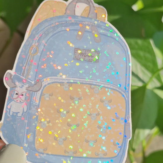 Hand drawn sticker. Blue backpack with a moose keychain. Printed on premium matte, water resistant vinyl. Matte or lamination option available.